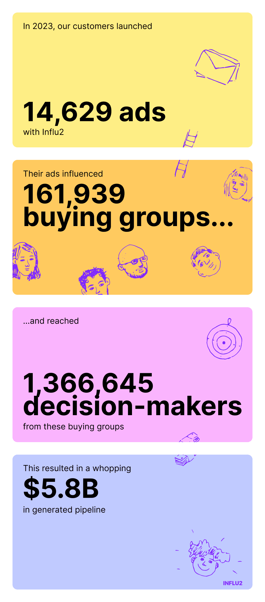 Join us for a quick exploration of advertising results Influ2's exciting milestones of 2023. From successful campaigns to tech triumphs, let's celebrate the colorful moments of the past year!