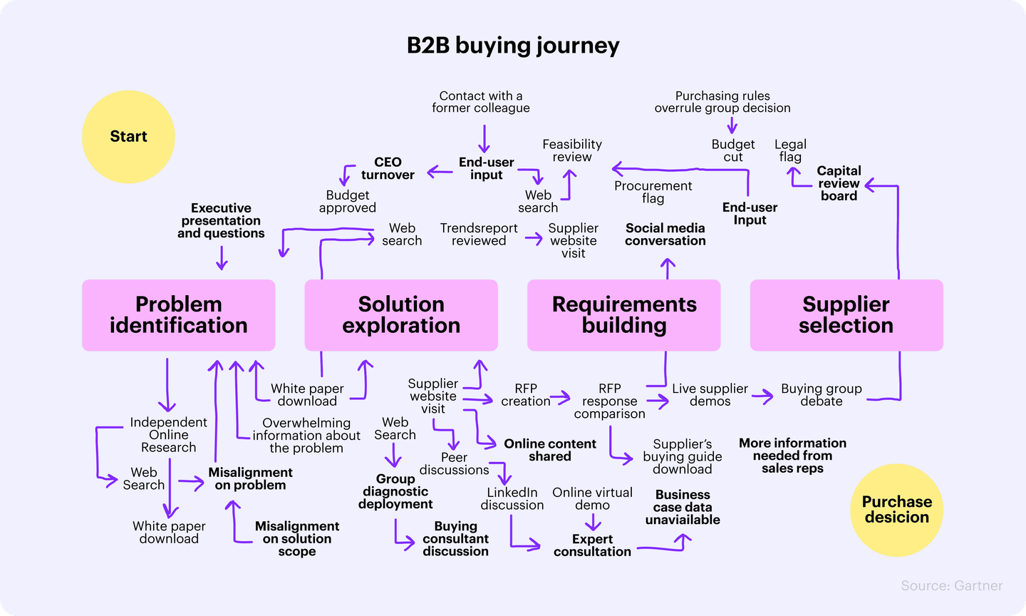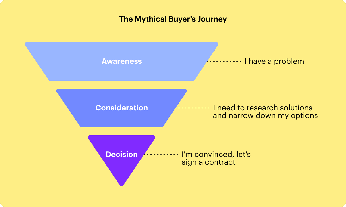 Here’s the thing though: the B2B buying journey is rife with indecision, too many stakeholders, budget chokeholds, and intense competition. It’s anything, but simple and linear.