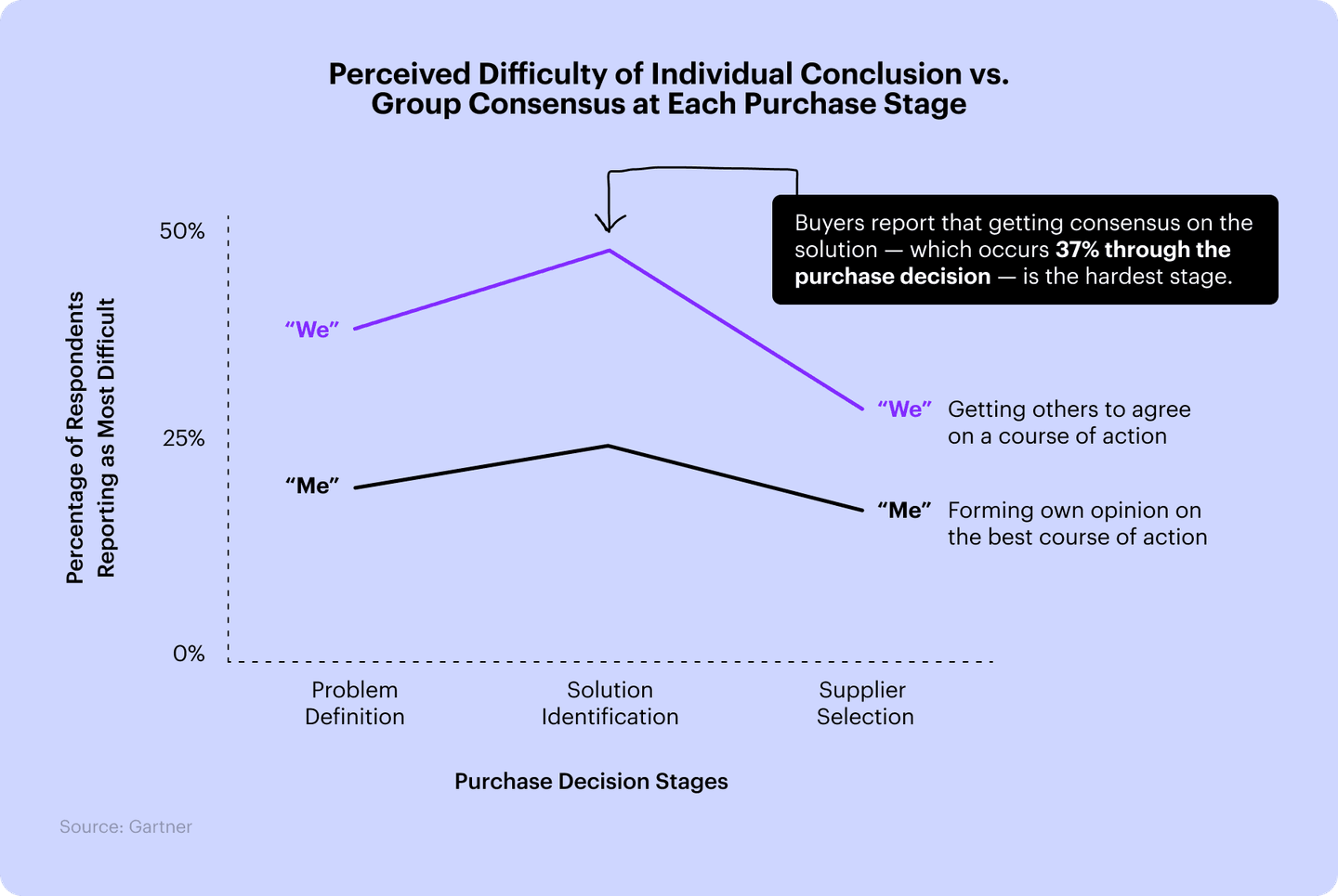 The average B2B buying group now includes 11 active members, each with influence over the budget and their own perspective on needs and urgency. Gaining consensus is the most challenging stage.