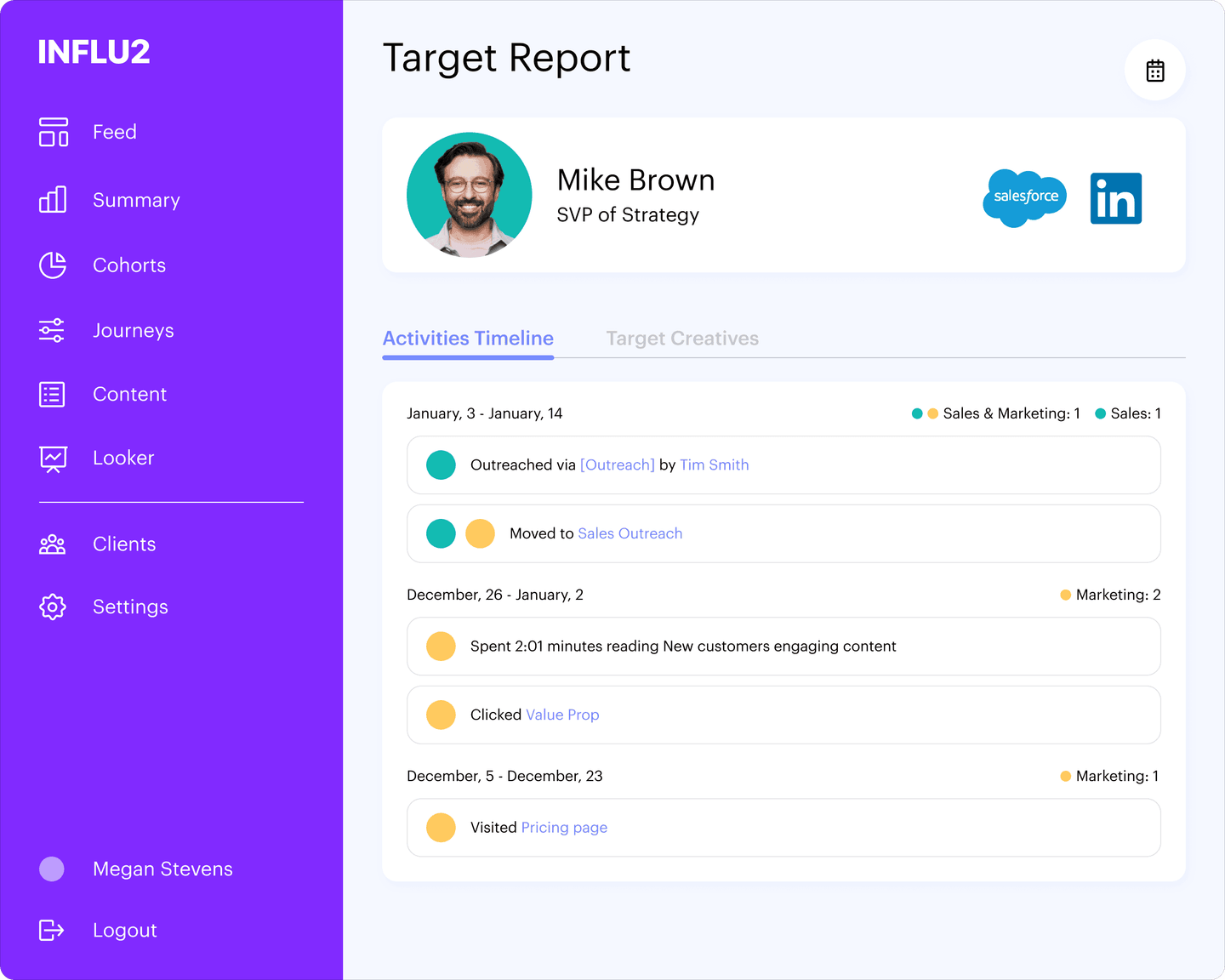 Influ2’s platform does this automatically, calculating a behavioral score based on ad and landing page engagement. It uncovers typically hidden insights, like how quickly someone clicked on an ad and how long they spent on the landing page. As the account readiness score increases, this will let your commercial teams know when an account is ready for outreach.