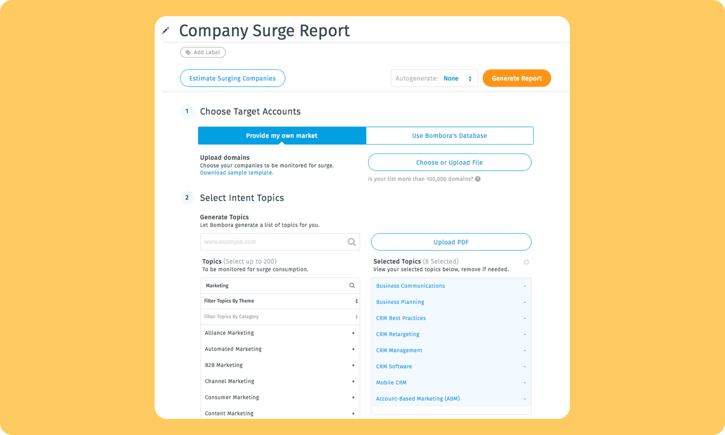 Setting up this report takes some time, and you’ll have to do the backend work of understanding who your target market is and knowing which topics indicate intent. But once this is done, Bombora will show you which companies are surging in intent.
