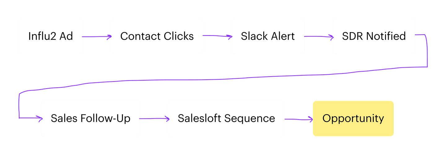When a contact engages with an Influ2 ad, that signal flows directly into a dedicated Slack channel monitored by Sales. They’re able to see who engaged and what they engaged with, so reps can tailor their outreach with precision. If a rep doesn’t follow up within 24 hours, Sales leadership steps in.