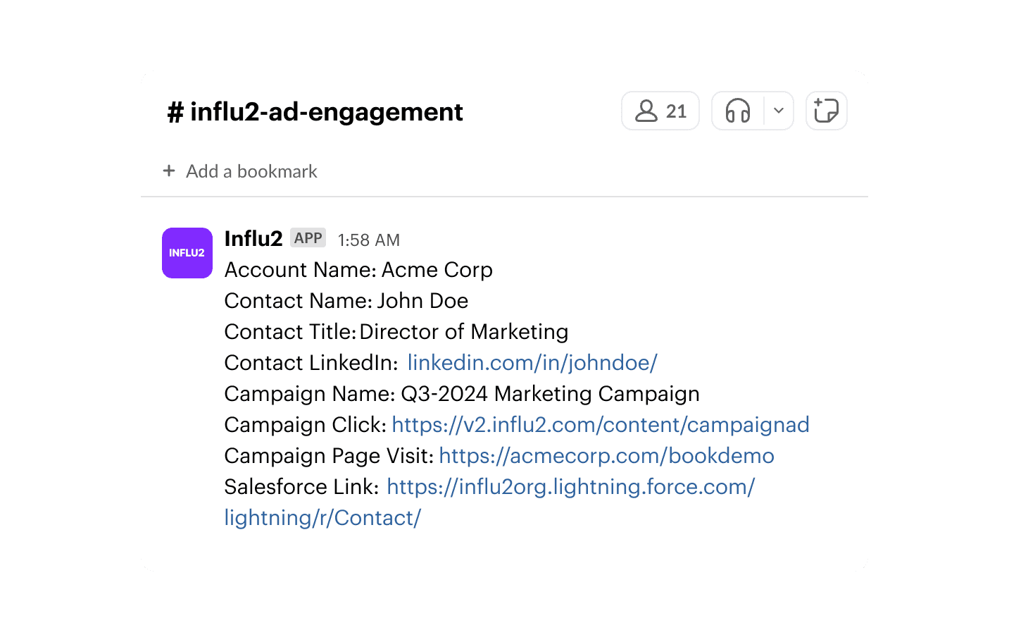 At CipherHealth, integrating marketing strategies with sales execution is streamlined through advanced automation. Using Influ2’s Slack integration, Marketing delivers real-time ad engagement data to the sales team.