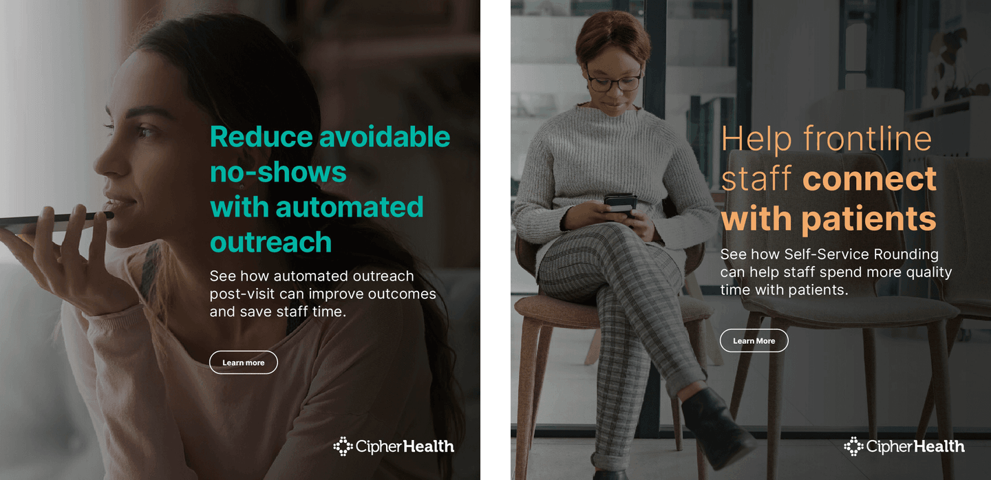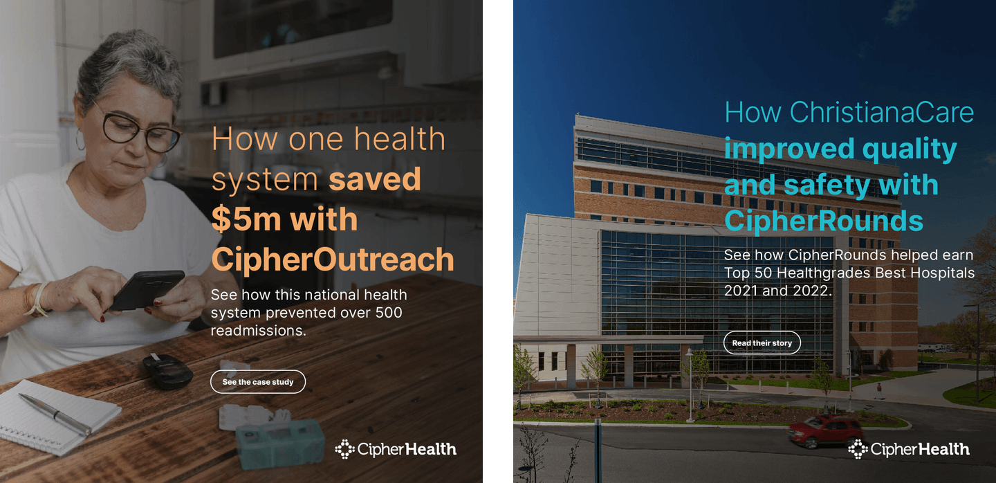 CipherHealth's marketing team crafted a strategy to personalize ads across the entire buyer journey, from initial awareness to decision-making. They segment ads by use case, delivering ads based on their product solutions to a mix of prospects to drive new business revenue and current clients for cross-sell expansion opportunities.