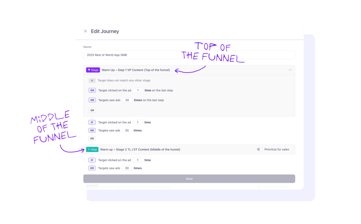“We design campaigns around specific personas and adapt the ad journey based on how each person engages over time,” says Bailey Creeden, Senior Media Buyer at Marketbridge. “It’s just like a nurture stream—but with ads.”