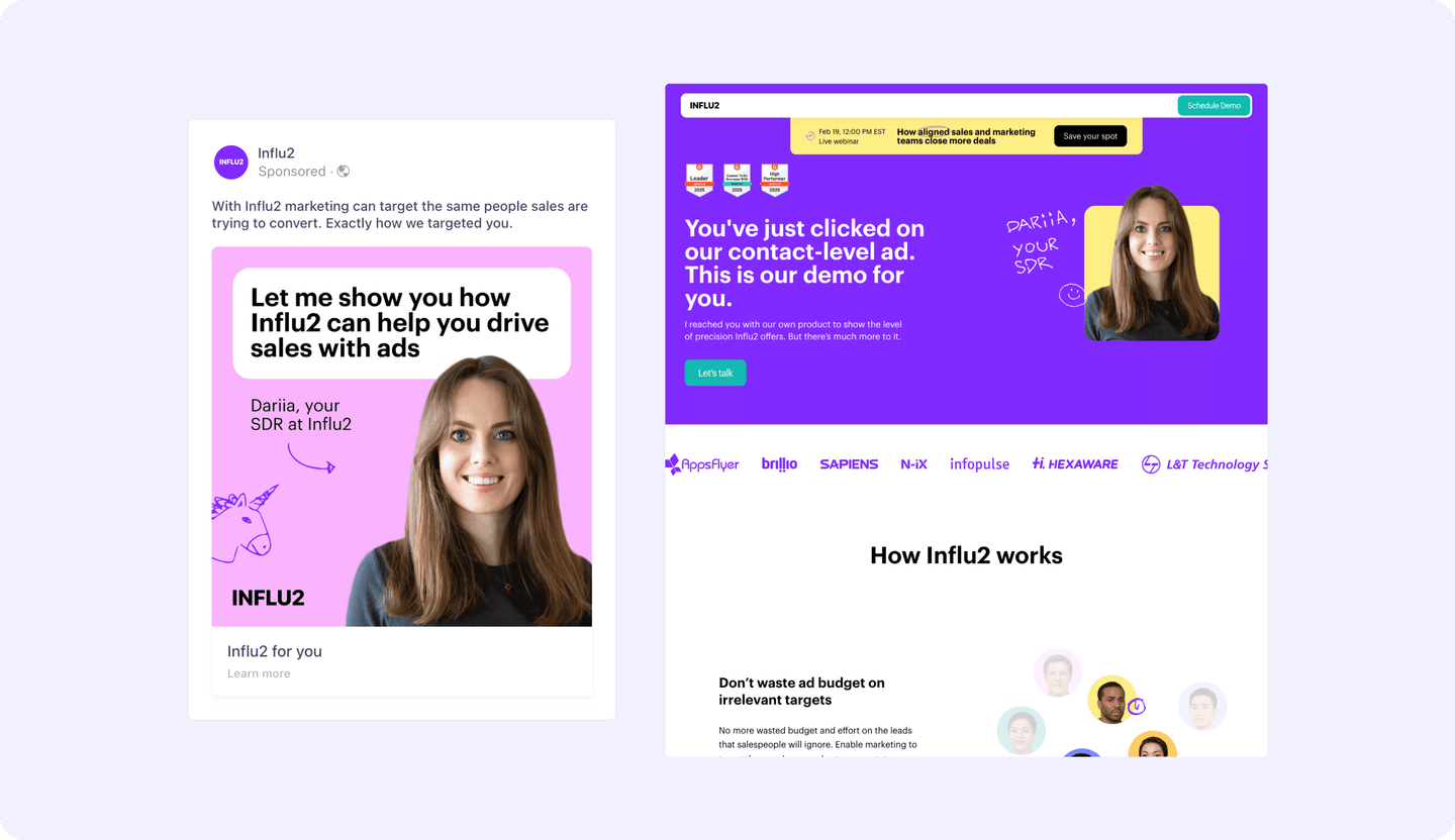 Influ2 is provides contact-level ABM. When you have a clear account list and have identified the buying group in your target accounts, you can use Influ2 to target those people directly with ads.