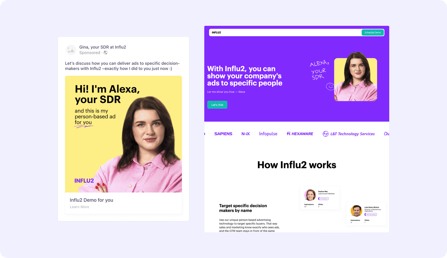 With Influ2, you upload a list of named buyers and show ads to each individual prospect that are relevant to their persona and stage in the buying journey.