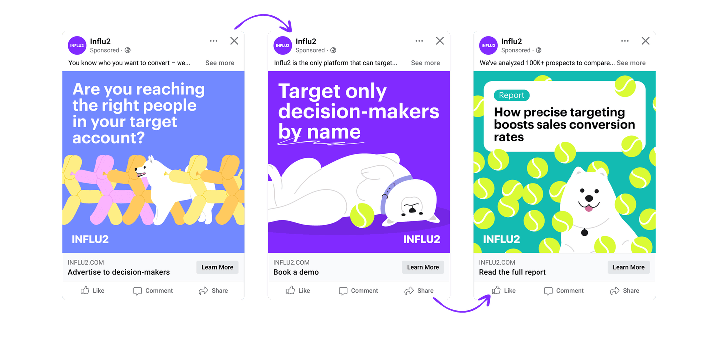 That’s why it makes more sense to tailor ads for each person based on their current journey stage. What’s also important is to consider buyers’ engagement with ads and use them for personalization. Clicks and impressions are actionable signals to move prospects to the next bunch of creatives. They show just how much information the prospects have already consumed and whether it resonated.