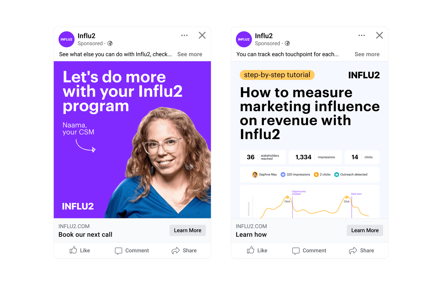 1. Influ2 ad engagement data. Influ2 tracks a user's interaction with your ads, including impressions, clicks, and landing page visits. This data helps you understand their level of engagement and current stage in the customer journey. For instance, if a prospect clicks on your theoretical guide and a few value props, it’s safe to assume they now require more advanced content. So it’s time to adjust ad creatives and show more information about specific case studies or use cases.