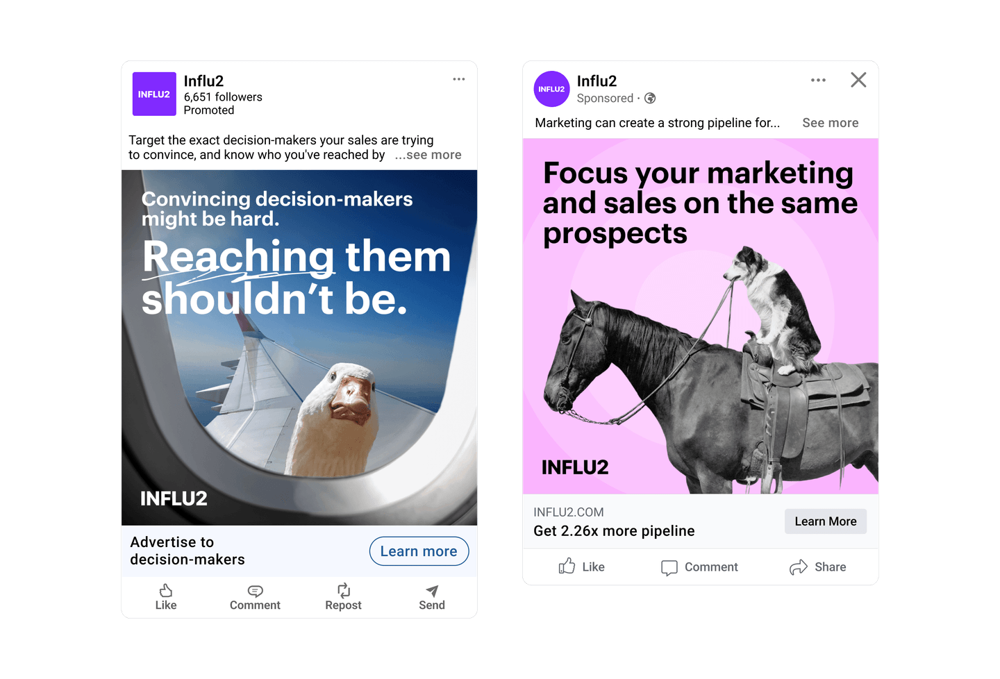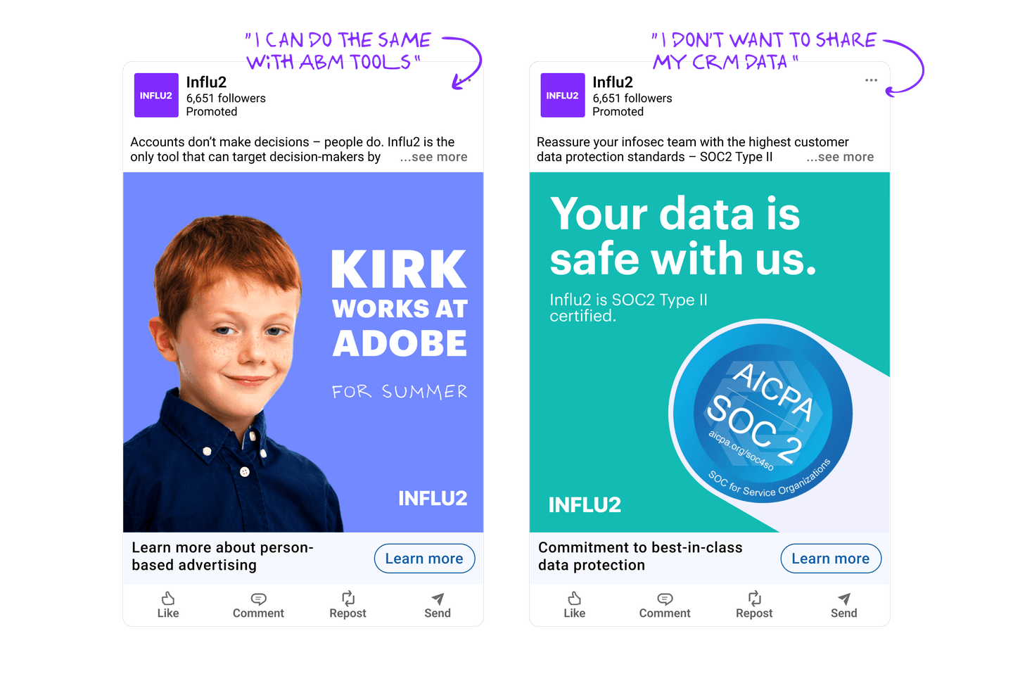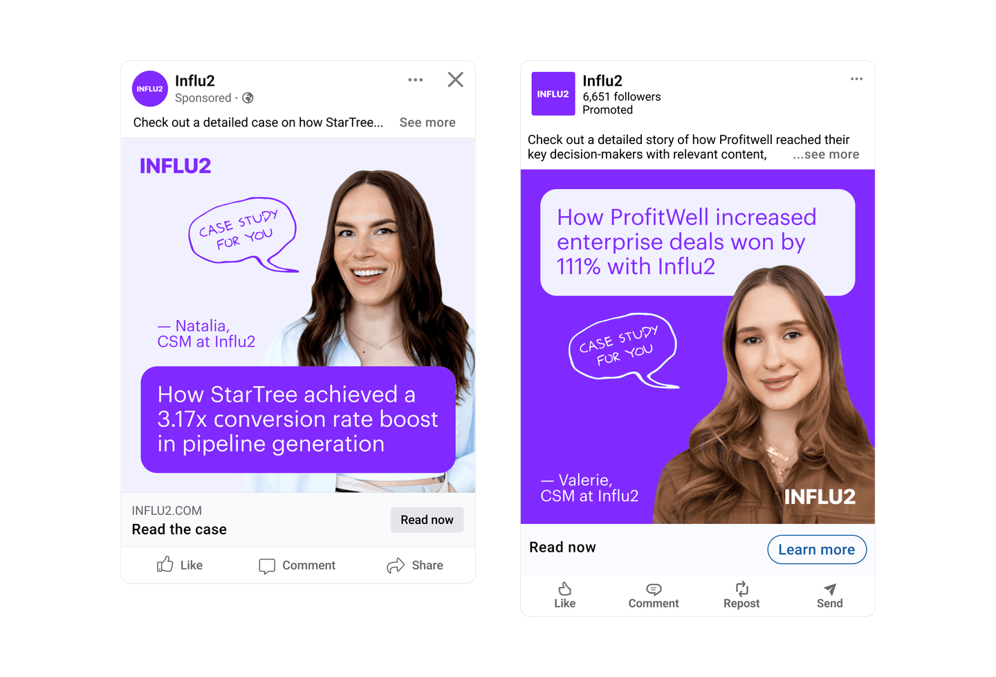 2. Data points from your CRM. Influ2 integrates seamlessly with your sales tools to gather additional context. The platform gathers info about email correspondence, CRM scores, new opportunities and their stages, won and lost deals, as well as other sales data points. This provides a deeper understanding of the target audience's specific needs and interactions with your sales team. For instance, an SDR has been sending outreach emails to a target. During this time, marketers can support sales prospecting by running ads with a personalized introduction of this SDR. It’s a great way to help sales build personal connections through other channels. Once a prospect agrees to a call, the ad content should evolve to the next stage – e.g. demo invites, case studies from similar industries, etc.