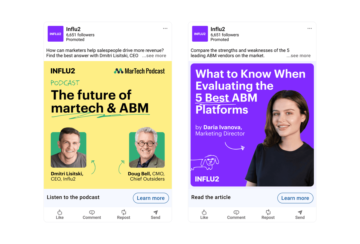 The traditional ABM platforms allow you to move entire accounts through the journey. But if the goal is to provide a personalized ad experience to each buyer, this approach simply won’t do. As a contact-level ABM engine, Influ2 shows ads to specific people. This means that you can create custom journeys for different groups and automate ads swap for each person.