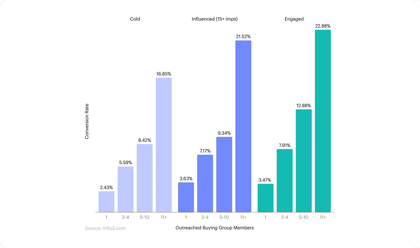 Prospects who’ve seen ads at least 15 times or engaged with them have a higher conversion rate across all buying group sizes.
