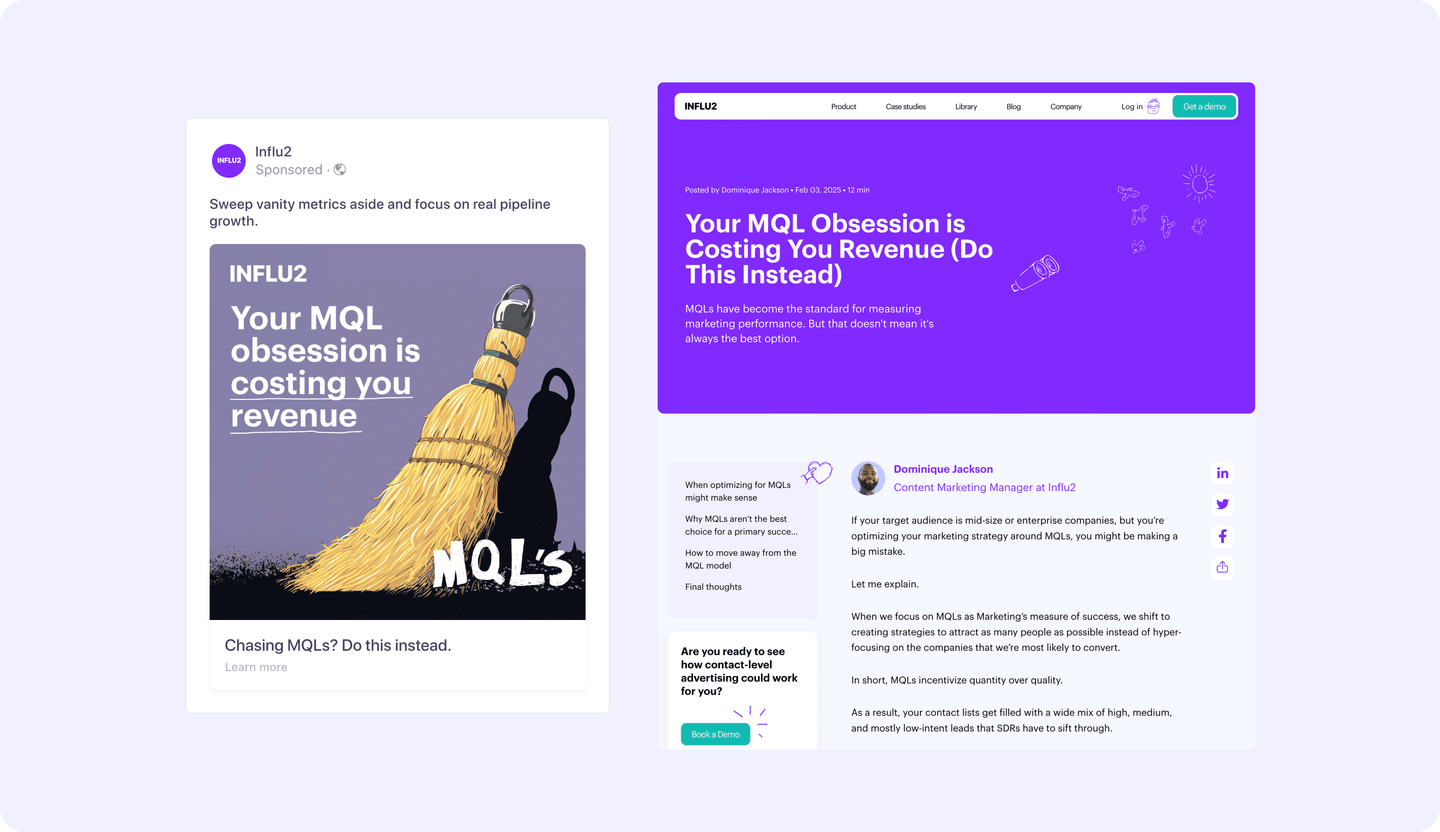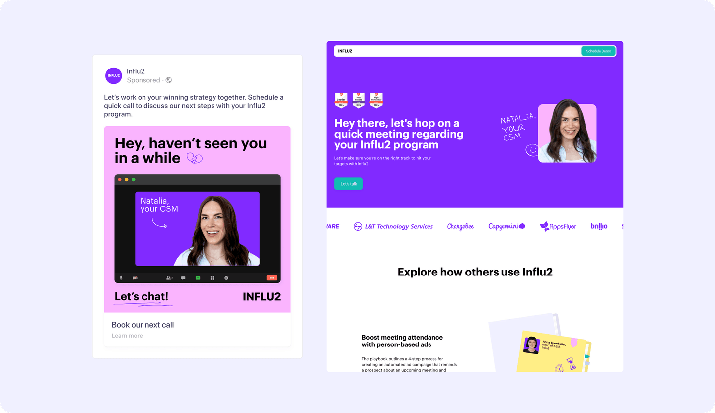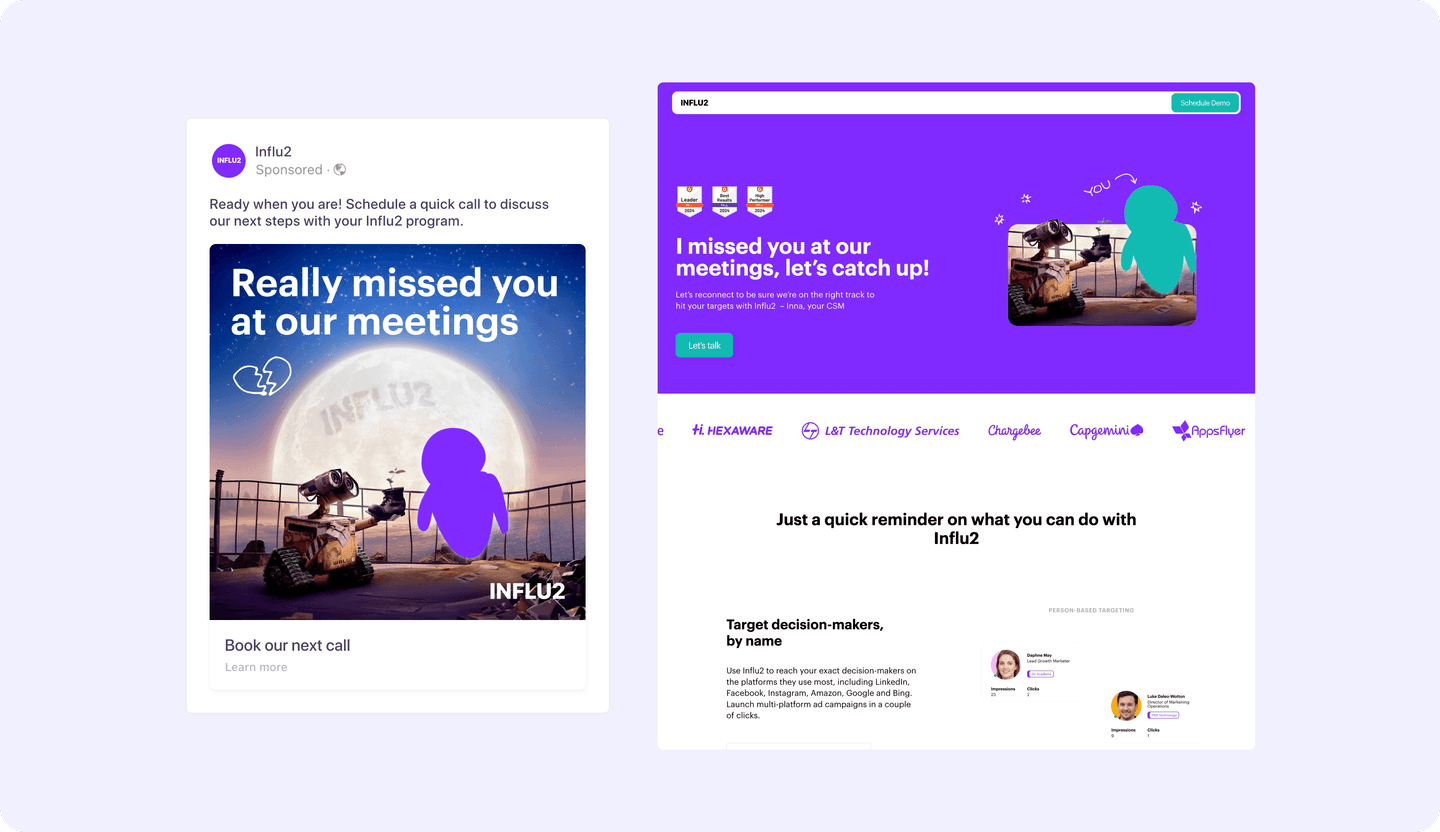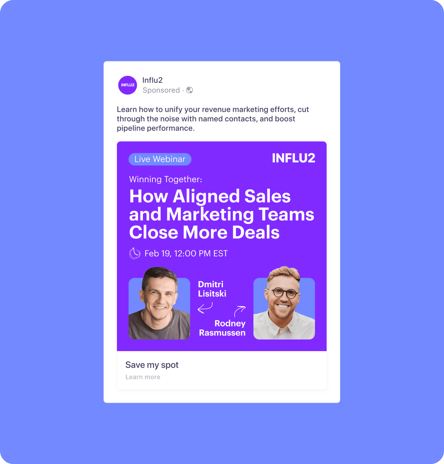 For instance, we recently held a webinar to launch our new Sales & Marketing Alignment Dashboard. As part of the promotion, we ran contact-level ads (with Influ2) targeting customers who’d benefit from the feature.